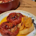 δ)Προθερμαίνουμε το φούρνο στους 220 βαθμούς Κελσίου. Ψήνουμε το φαγητό μας για 1 με 1½ ώρα περίπου μέχρι το φαγητό μας να πάρει χρώμα, προσέχοντας μην χρειαστεί νεράκι.