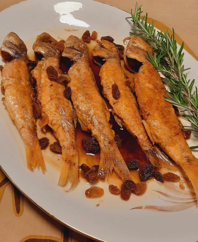 β) Σε ένα τηγάνι βάζουμε ελαιόλαδο να κάψει, τηγανίζουμε τα ψάρια, τα αφαιρούμε και τα αφήνουμε στην άκρη.
