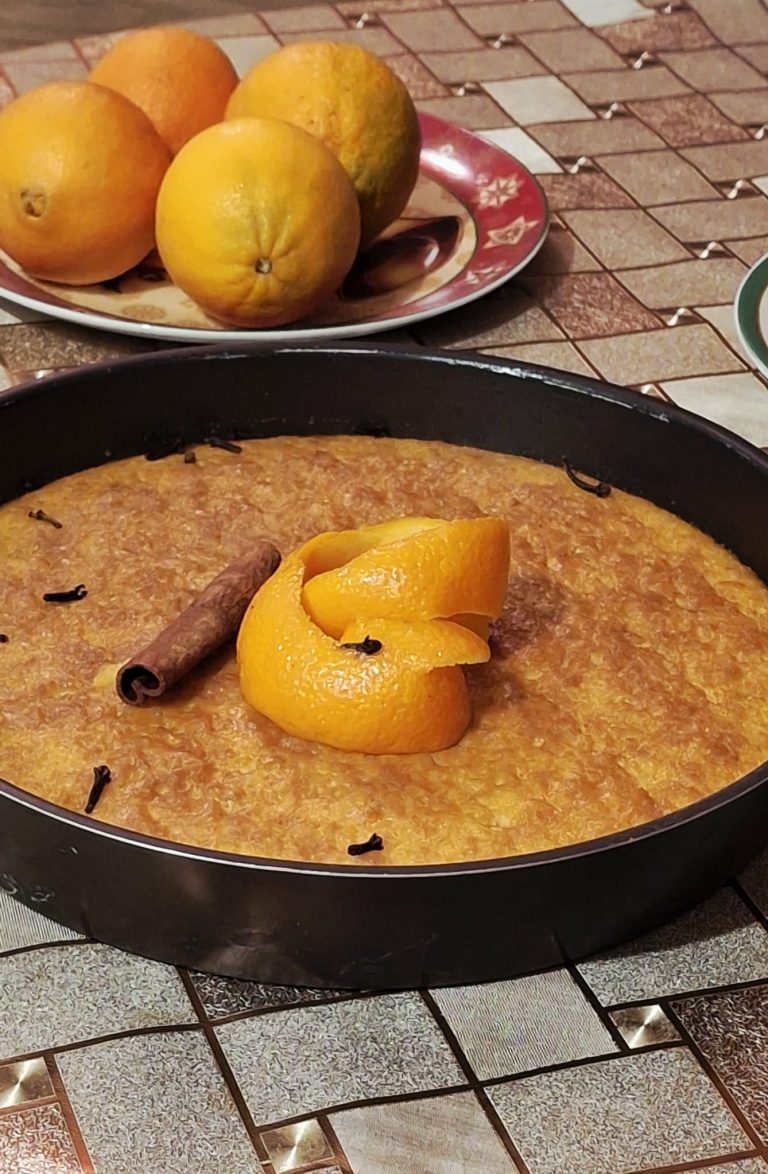 ε)Κόβουμε το γλυκό σε τετράγωνα κομμάτια και το σιροπιάζουμε σιγά – σιγά, ζεστό το γλυκό, ζεστό το σιρόπι.